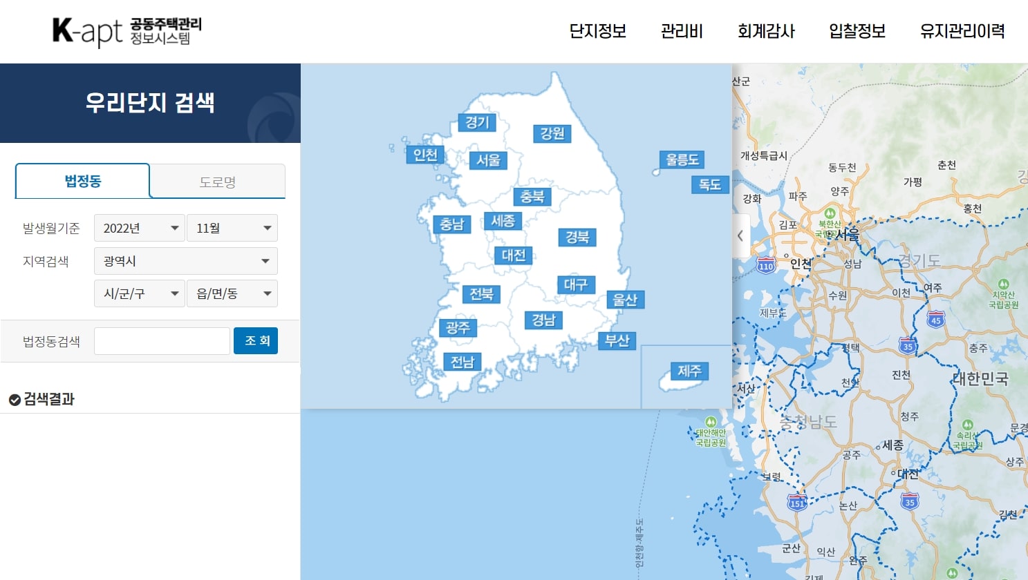 왼편 ”우리단지 검색” 아래 법정동 혹은 도로명 검색 중 하나를 선택하여 관리비 조회를 할 아파트를 검색해 주세요. 관리비 발생월기준의 경우 관리비를 확인하고 싶은 달로 설정해 주시면 됩니다.
