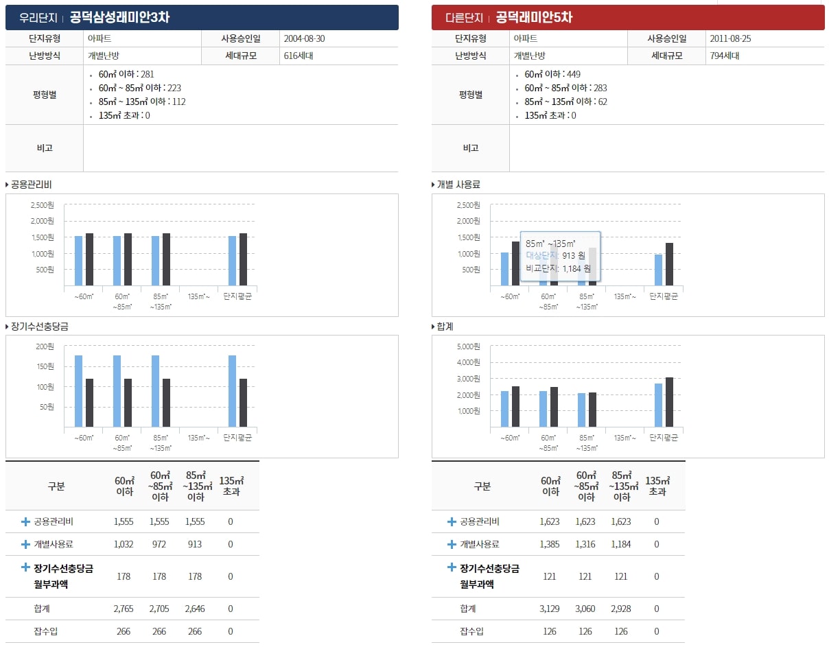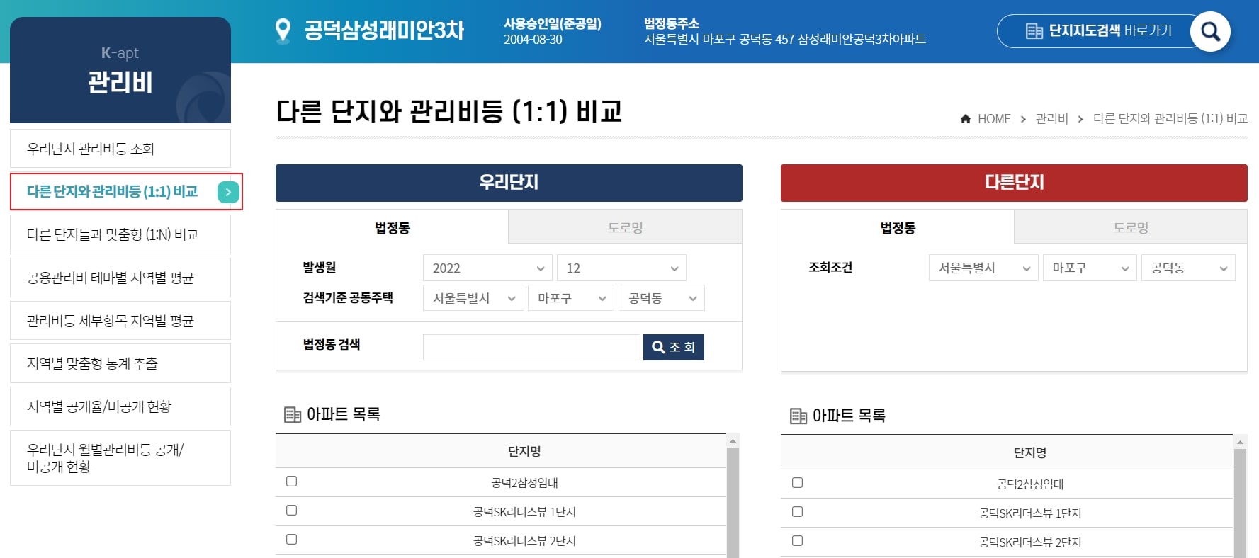 왼쪽 메뉴에서 “다른 단지와 관리비등(1:1) 비교”를 클릭하면 다른 단지와 관리비 비교를 하는 것도 가능합니다. 우리 단지에는 자신이 거주하는 아파트를 선택하고 다른 단지에 비교를 하고 싶은 다른 아파트를 선택해 주세요.