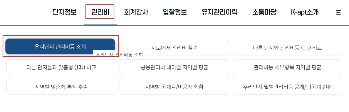 아파트 관리비 조회 서비스를 이용하기 위해 상단 “관리비” 메뉴 하위 메뉴 중 “우리 단지 관리비등 조회”를 클릭해 주세요.