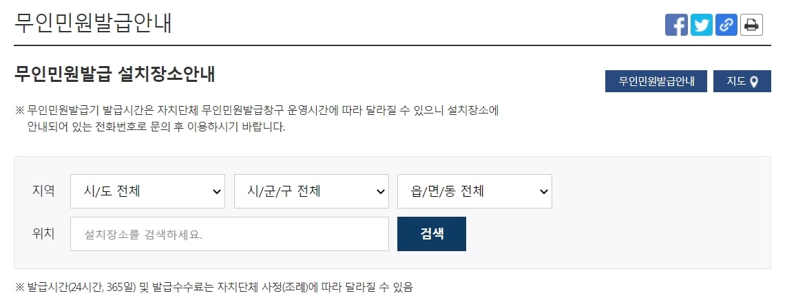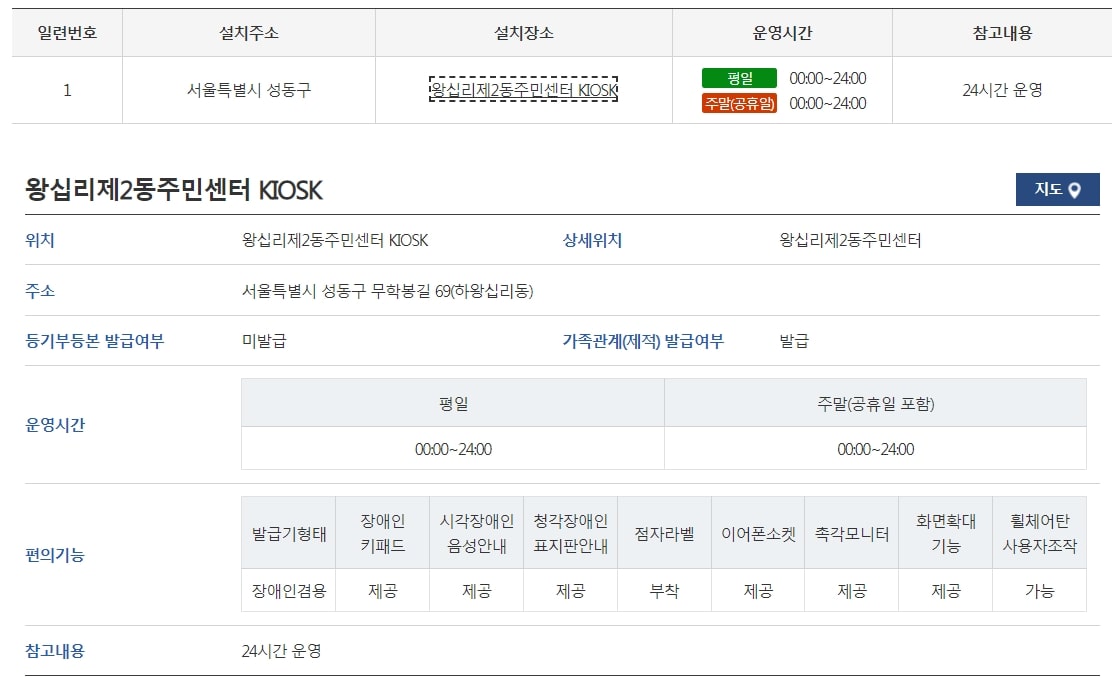 검색을 마치면 해당 지역과 가까운 무인민원발급기 안내가 나오며 “설치장소” 부분을 클릭하여 세부적인 위치와 주소, 운영시간과 편의기능 등의 내용을 확인하실 수도 있습니다.