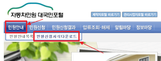 상단 메뉴 중 “민원안내” 하단에 “민원신청서식다운로드” 메뉴를 클릭해 주세요.