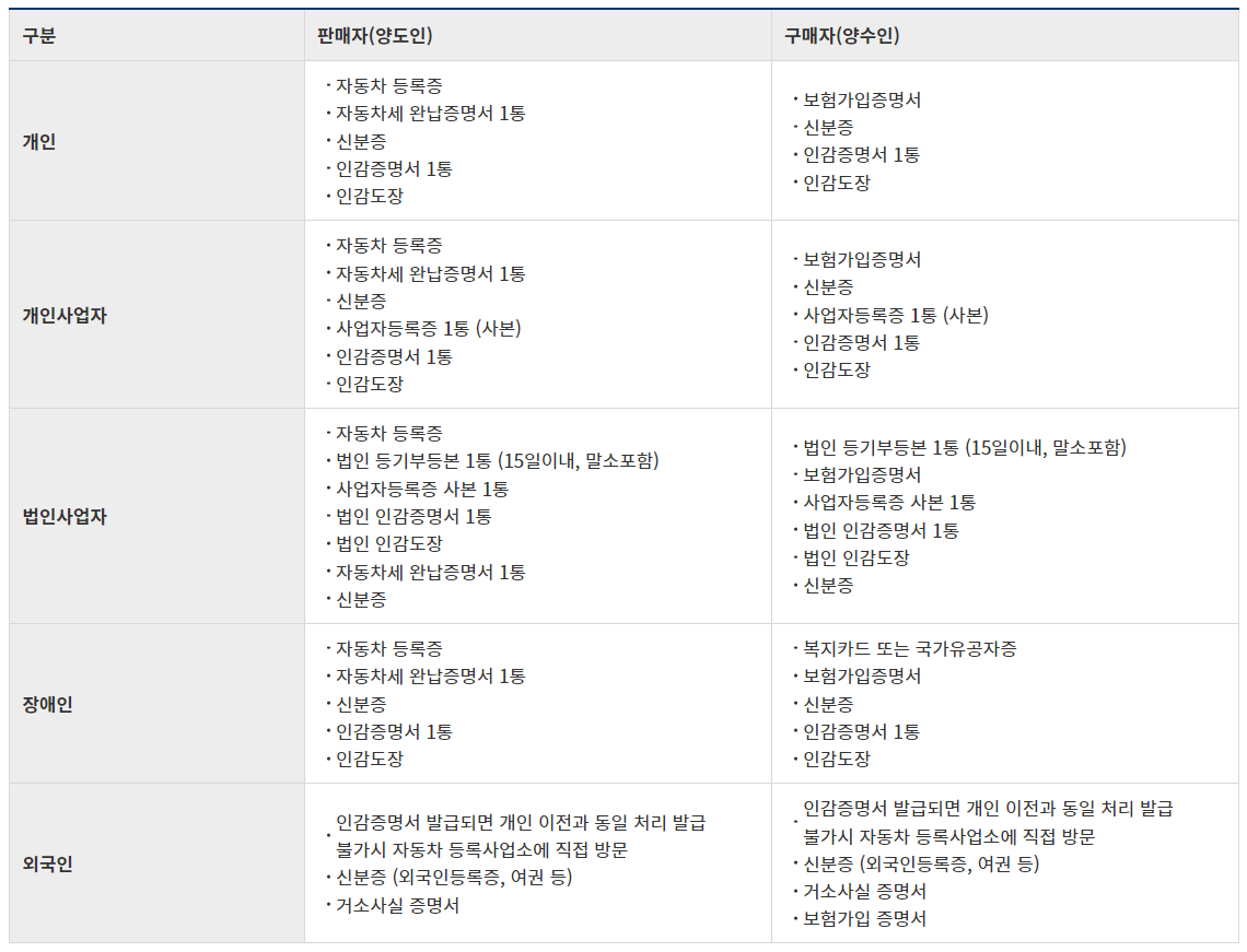 자동차 거래는 큰 돈이 오고 가는 만큼 신중하게 진행하는 것이 좋으며 필요한 절차와 서류는 미리 확인해 두는 것이 좋습니다. 자동차 양도증명서를 비롯한 서류를 확인하여 안전한 자동차 매매를 진행하시기 바랍니다.