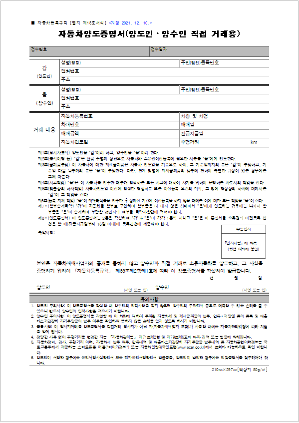 먼저 상단 빈칸에는 판매자(양도인)의 인적사항을 기재하시면 됩니다. 하단 빈칸에는 구매자(양수인)의 인적사항을 적어주시면 되는데요. 여기서 주의할 점은 반드시 자필로 적어야 한다는 것입니다. 거래 내용에는 자동차등록번호와 차종, 차대번호, 매매금액과 매매일, 주행거리와 자동차 인도일 등의 정보를 기재해야 하므로 사전에 확인해 두는 것이 좋습니다. 모든 내용을 작성하였으면 내용 확인 후 하단에 서명날인 하시면 모든 절차가 마무리됩니다.