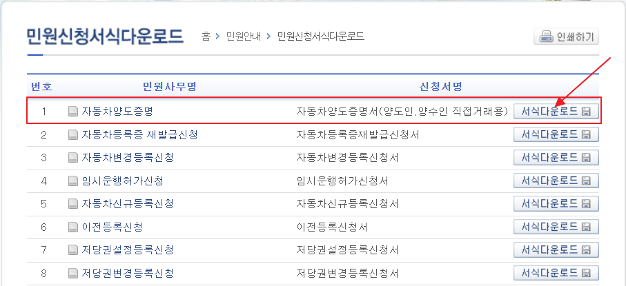 다양한 서식 파일 중 제일 상단에 “자동차양도증명” 서식 파일을 찾으실 수 있을 것입니다. “서식 다운로드”를 클릭하면 간편하게 자동차 양도증명서 다운로드를 할 수 있습니다.