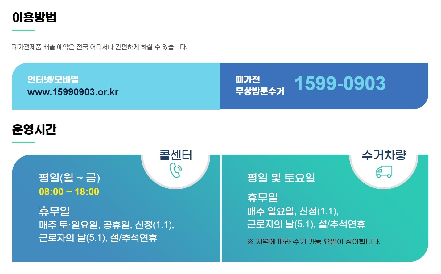 폐가전제품 무상 방문 수거는 전국 어디서나 순환 거버너스 홈페이지나 [1599-0903] 번호로 전화를 하여 예약하실 수 있습니다. 콜센터의 경우 평일 오전 8시부터 18시까지 운영하므로 휴무일을 잘 체크해 보시기 바랍니다.