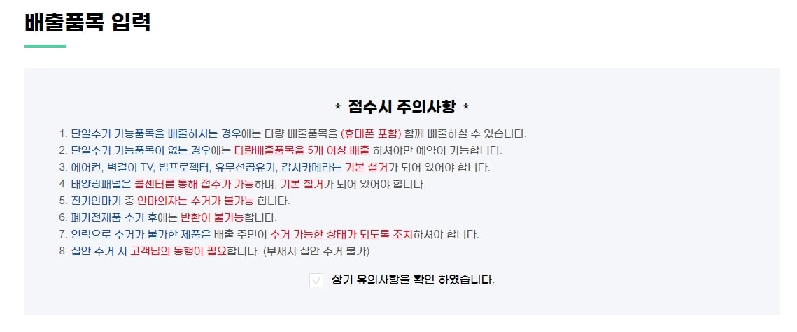 배출품목 입력 전 안내사항을 확인해 주셔야 합니다. 원활한 수거를 위한 기본 안내사항이므로 꼼꼼히 확인해 보신 뒤 본인이 해당될 경우 수거 신청을 진행해 주시기 바랍니다.