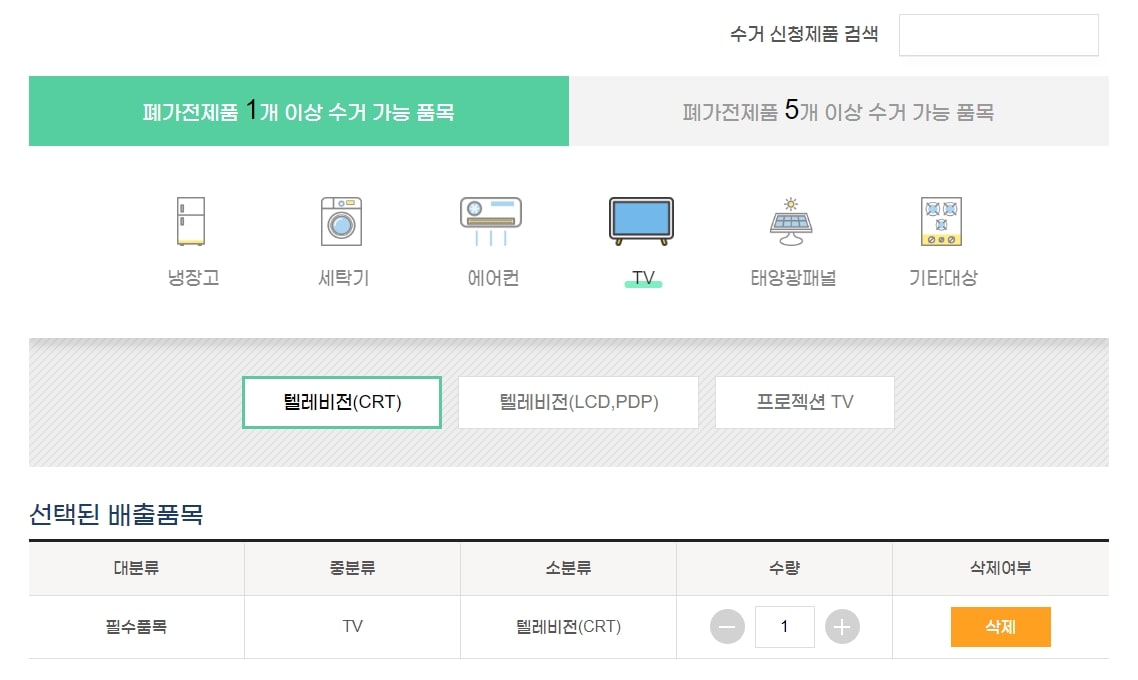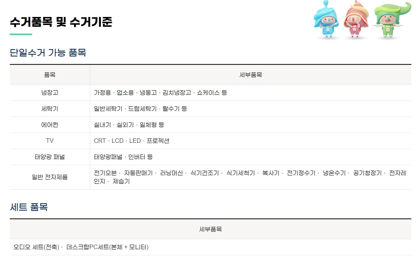단일수거 가능 품목과 세트로만 수거가 가능한 품목들이 정해져 있으므로 사전에 확인하여 신청을 하시기 바랍니다.