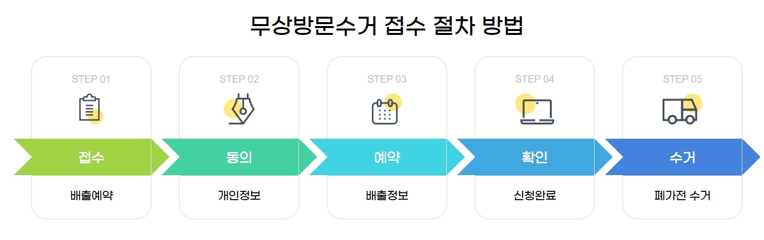 폐가전제품 무상 방문 수거 서비스를 이용하려면 먼저 수거 신청을 해야 합니다. 수거 신청은 인터넷 및 전화를 통한 배출예약, 개인정보 동의, 배출정보 입력, 신청 완료 및 폐가전 수거의 단계로 진행됩니다.