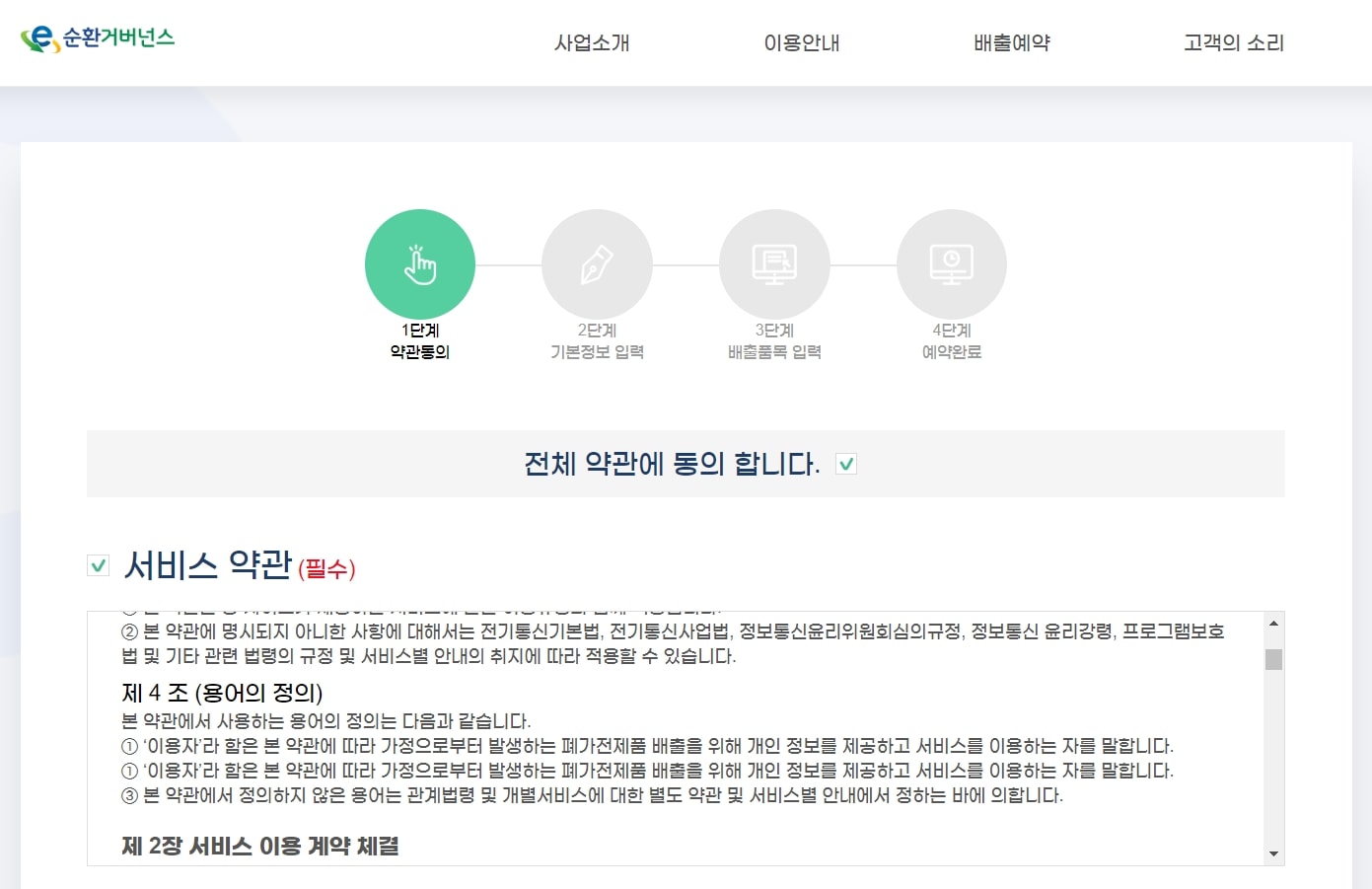 인터넷 홈페이지에서 폐가전제품 무상 방문 수거 신청을 하는 경우 [배출예약] 메뉴를 클릭하여 이용하실 수 있습니다. 우선 약관에 동의를 해주신 뒤 기본정보와 배출정보를 입력하면 어렵지 않게 예약을 할 수 있습니다.