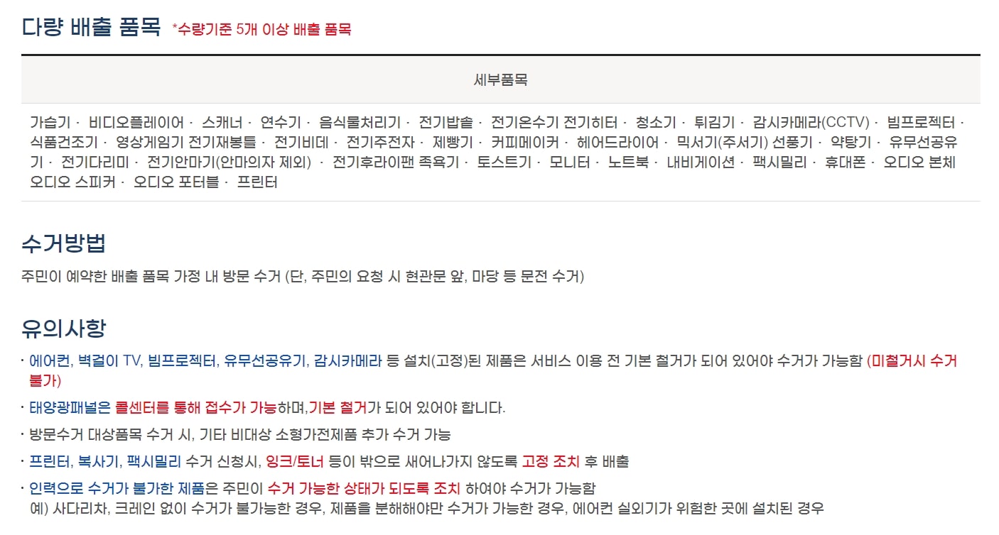 소형 가전의 경우 수량기준 5개 이상 배출이 가능하므로 세부 품목을 확인해 주시기 바랍니다. 에어컨이나 벽걸이TV 등 철거를 해야 하는 품목들은 기본 철거가 되어 있어야 수거가 가능하므로 사전에 유의사항을 꼭 확인해 보세요.