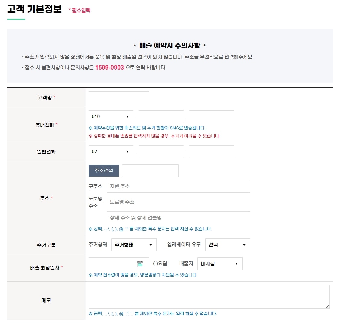 고객 기본정보 입력 페이지에서는 이름과 연락처, 주소 등을 입력하고 주거형태와 엘리베이터 유무를 순서대로 입력해 주시면 됩니다. 배출 희망일자에 가능한 날을 표기해 주신 뒤 배출지가 안인지 밖인지를 선택해 주세요.