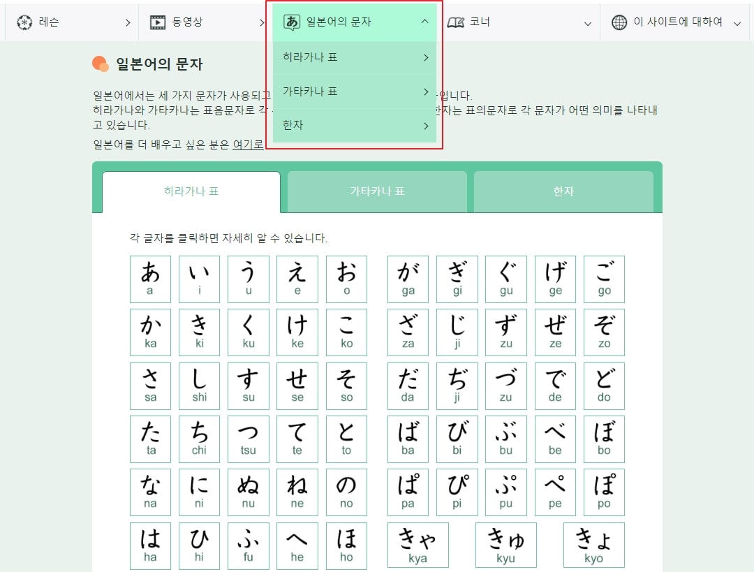 히라가나와 가타카나를 익히지 못한 분들은 “일본어의 문자” 메뉴를 클릭하면 히라가나 가타카나 표와 한자 자료를 살펴보실 수 있습니다.