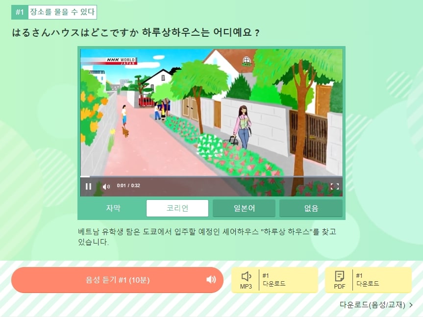 강좌를 선택하면 동영상 수업을 시청할 수 있으며 한국어, 일본어 자막을 선택하여 수강하는 것도 가능합니다. 듣기만 따로 하거나 MP3, PDF 교재 자료를 다운로드하여 이용할 수도 있으므로 참고해 주세요.