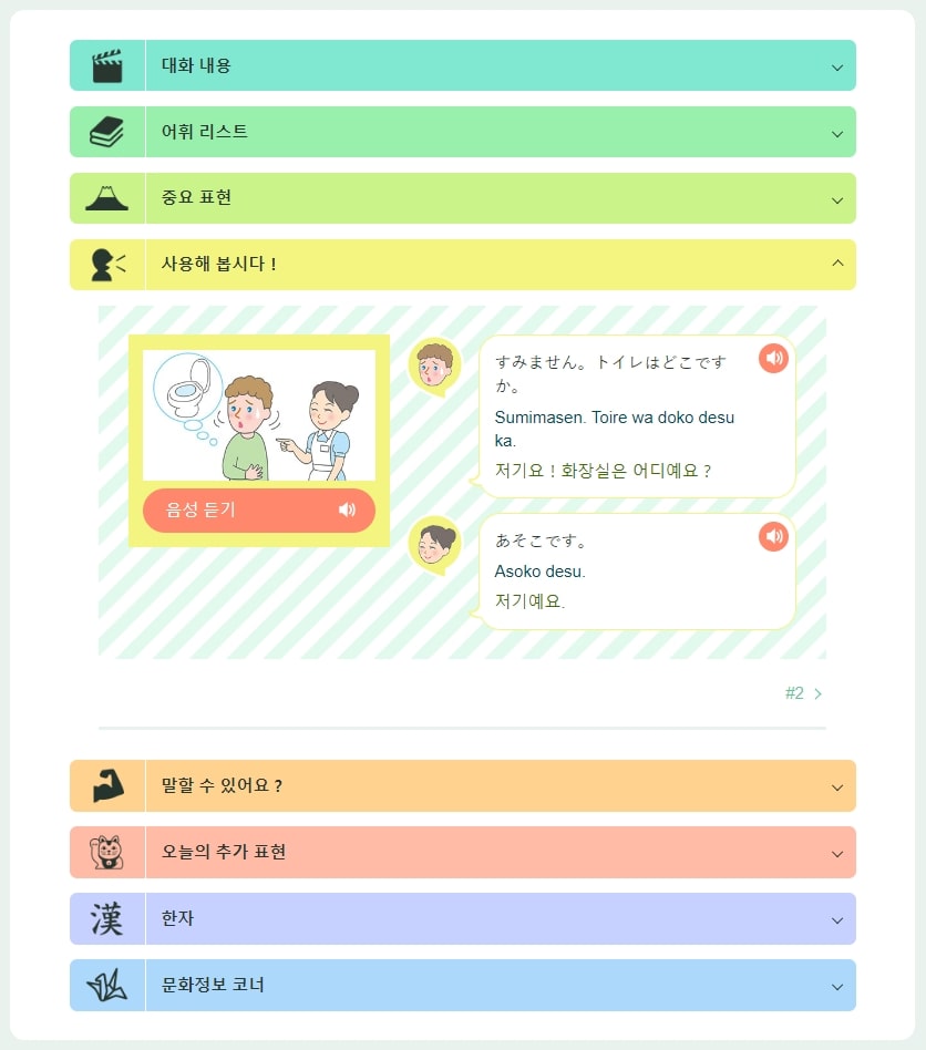 강좌 하단에서는 대화내용, 어휘 리스트, 중요 표현, 다이얼로그, 추가 표현과 한자, 문화정보 등의 추가 콘텐츠들을 클릭하여 살펴보실 수 있습니다.