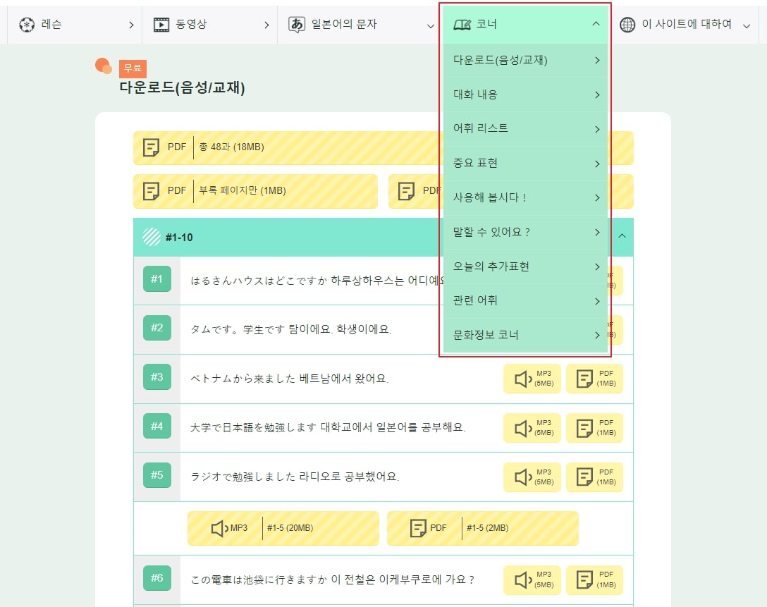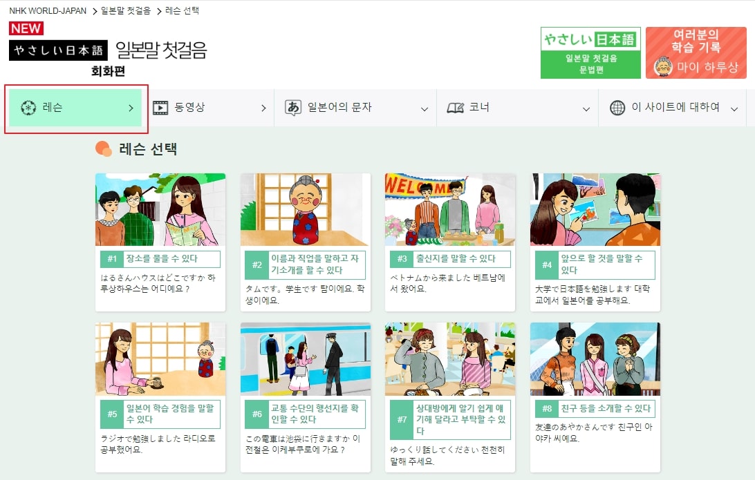일본말 첫걸음은 회화 중심으로 일본어를 배울 수 있는 초급 일본어 강좌로 동영상 강좌를 비롯하여 커리큘럼별로 어휘와 중요 표현, 한자 등의 자료들을 제공하며 필요한 자료는 다운로드하여 이용할 수 있습니다. 우선 상단 “레슨” 메뉴를 클릭하면 커리큘럼별로 강좌를 수강할 수 있습니다.