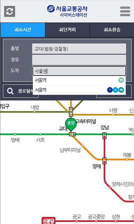 경로 탐색도 가능합니다. 최소시간, 최단거리, 최소환승 중 하나를 선택하신 뒤 출발지와 도착지를 입력해 주세요. 경유역의 경우 특별히 경유하는 곳이 없다면 공란으로 두셔도 됩니다. 입력을 마치셨다면 경로탐색을 클릭해 주세요.