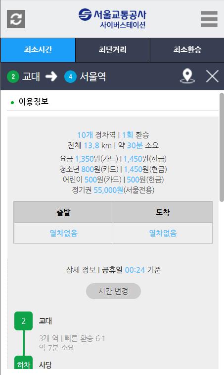 가령 최소환승 검색을 하면 소요시간과 요금, 최소환승 경로, 막차 시간표 등의 정보를 확인하실 수 있습니다.